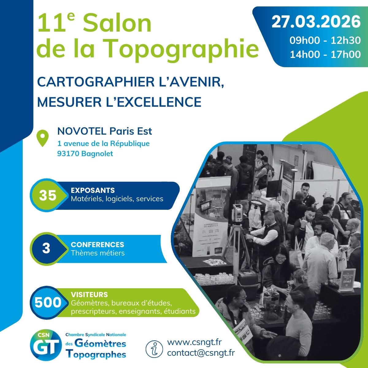 La CSNGT organise le 11e Salon de la Topographie, qui se déroulera à Paris le 27 mars 2026. Cet événement phare rassemblera les professionnels du secteur pour échanger, découvrir les dernières innovations et approfondir leurs connaissances. Ne manquez pas cette occasion unique de vous connecter avec des experts et de participer à des conférences enrichissantes !